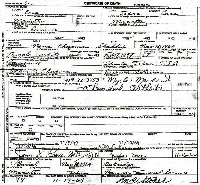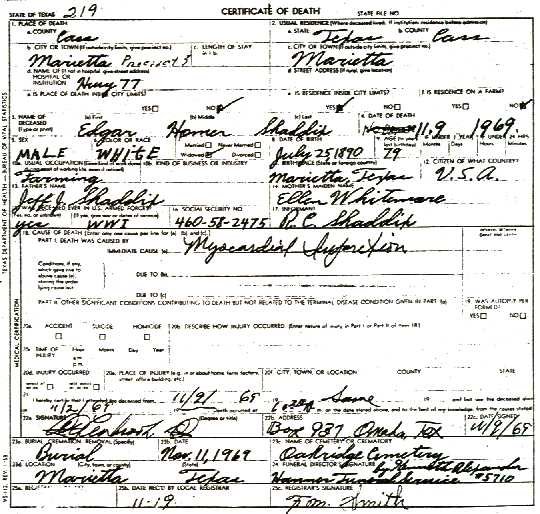 EDGAR HOMER5 SHADDIX (JEFF JOSHUA4, WILLIAM M.3, WILLIAM2, WILLIAM1) was born July 25, 1891 in Marietta, Cass Co., Texas, USA, and died November 09, 1969 in Marietta, Cass Co., Texas, USA. He married NONA G. CHAPMAN in Commerce, Texas, daughter of JOHN CHAPMAN and EMMA ADAMS. She was born February 17, 1897, and died November 10, 1964 in Marietta, Cass Co., Texas, USA.