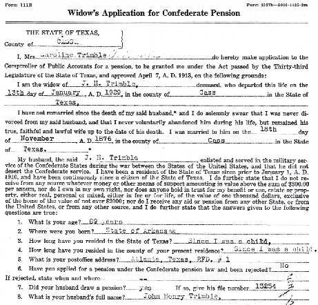 Caroline Trimble's Confederate Widow's Pension Application based on Civil War service of John Henry Trimble.